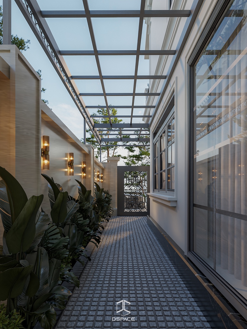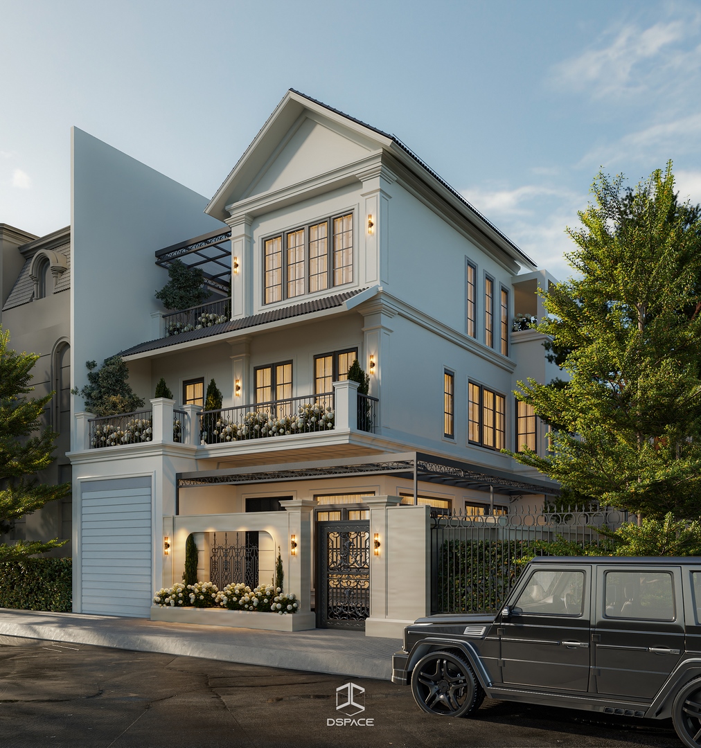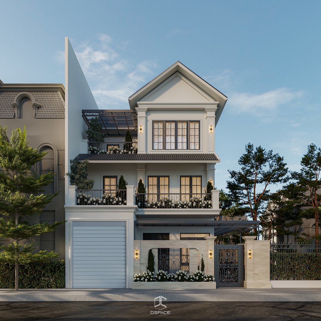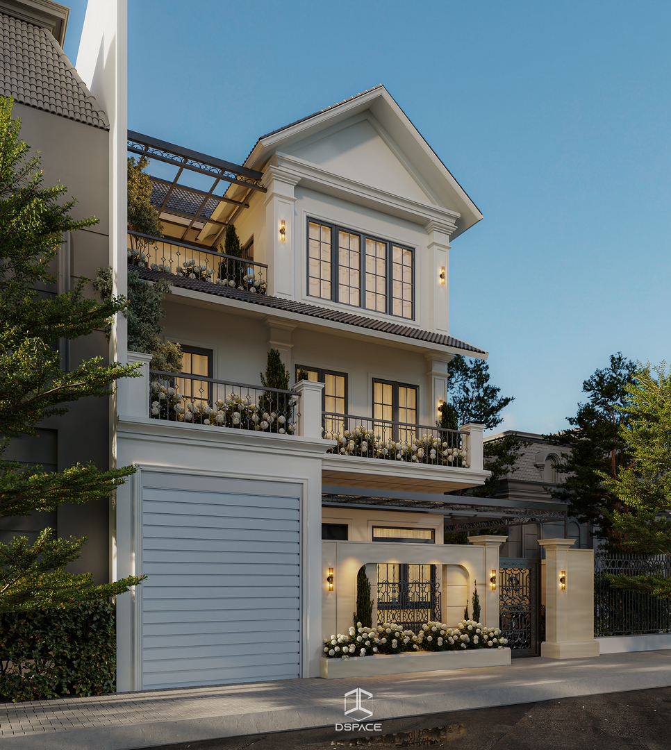 Ngoại thất công trình gây ấn tượng với hình khối kiến trúc cân đối, mái dốc đặc trưng và những ô cửa rộng mở đón ánh sáng tự nhiên. Các chi tiết phào chỉ được tiết chế, kết hợp cùng vật liệu và gam màu trung tính tạo nên cảm giác ấm áp, gần gũi và bình yên.