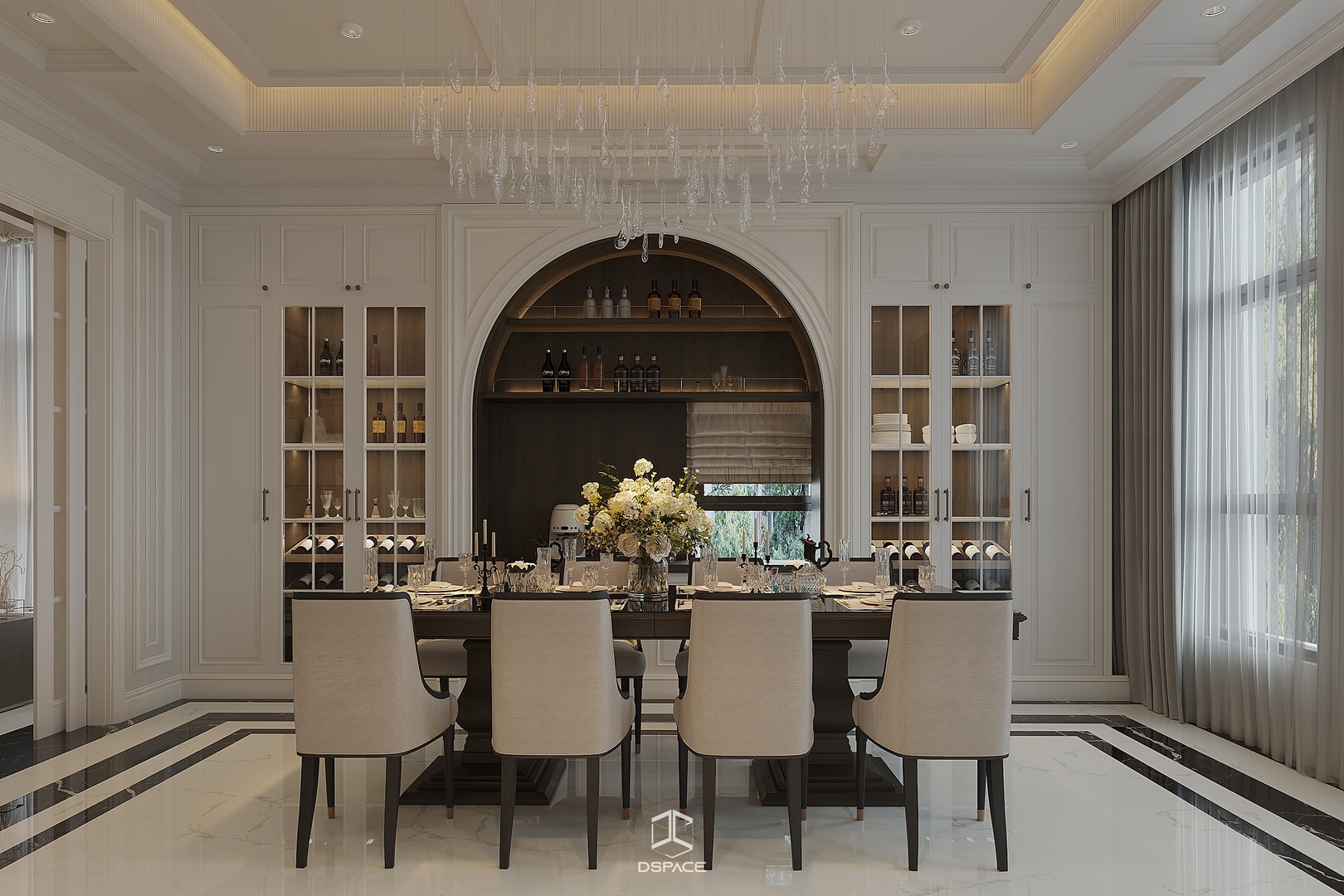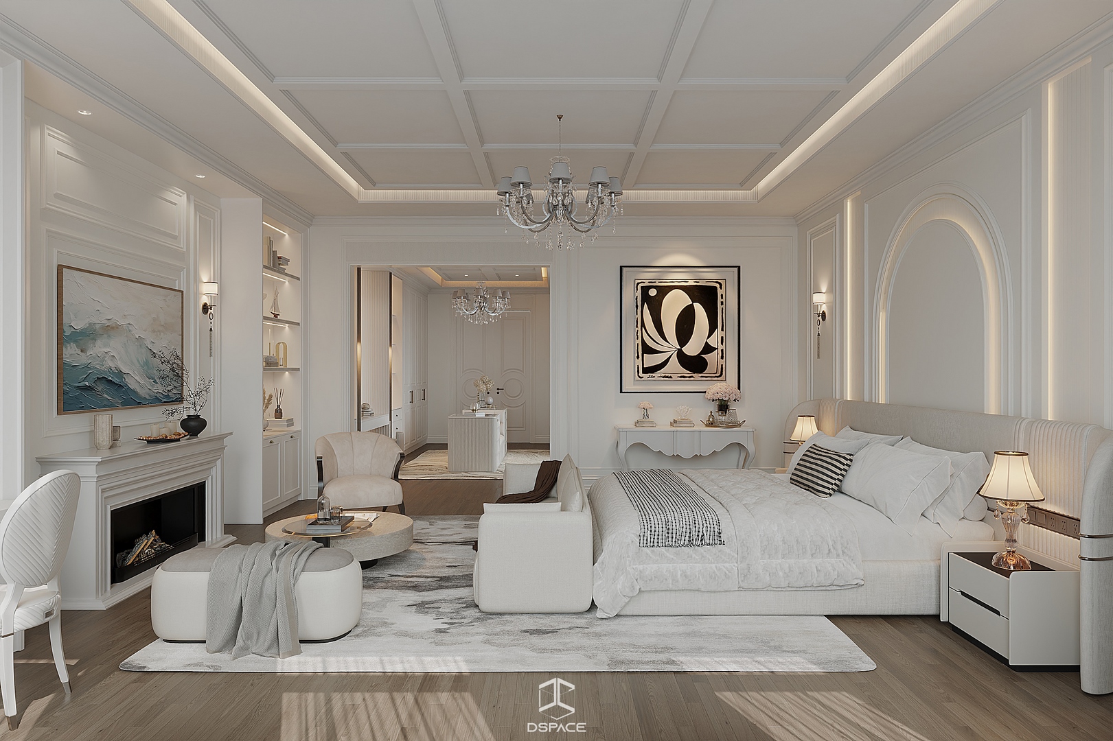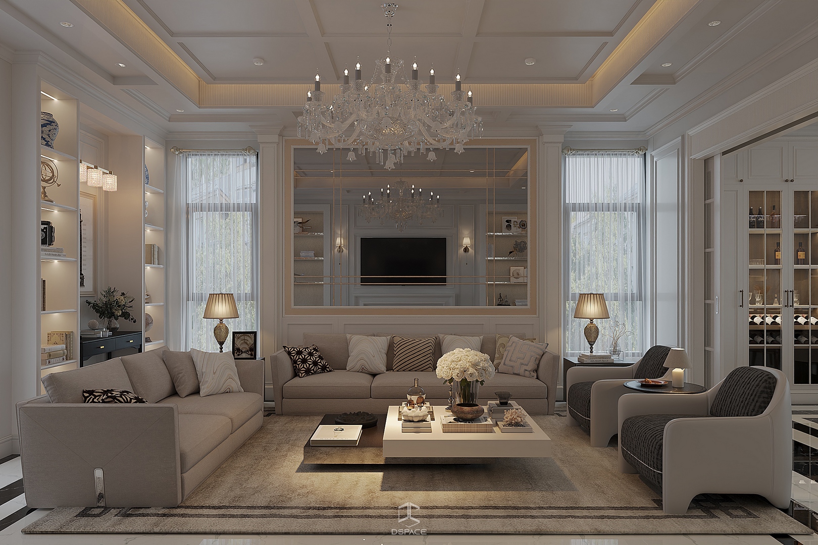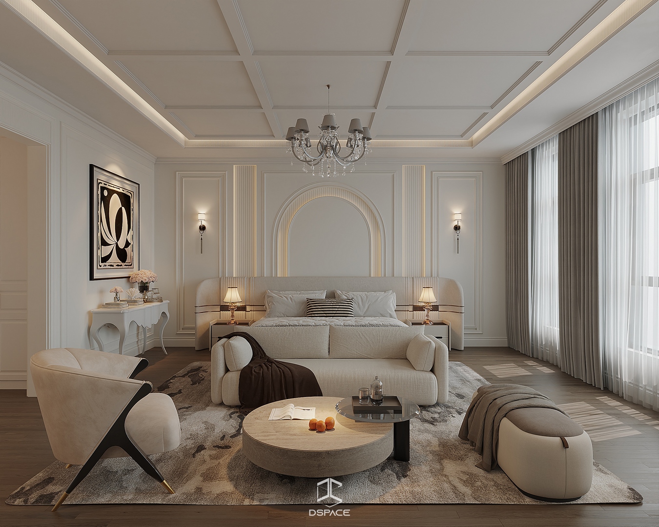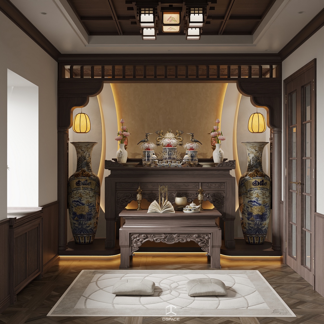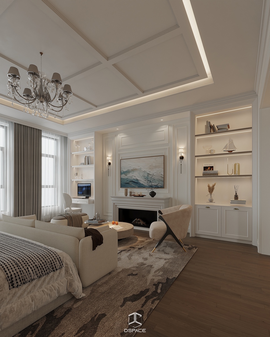 Hệ phào chỉ được xử lý tỉ mỉ, kết hợp cùng bố cục cân đối và ánh sáng tinh tế, tạo nên một tổng thể sang trọng nhưng không nặng nề.