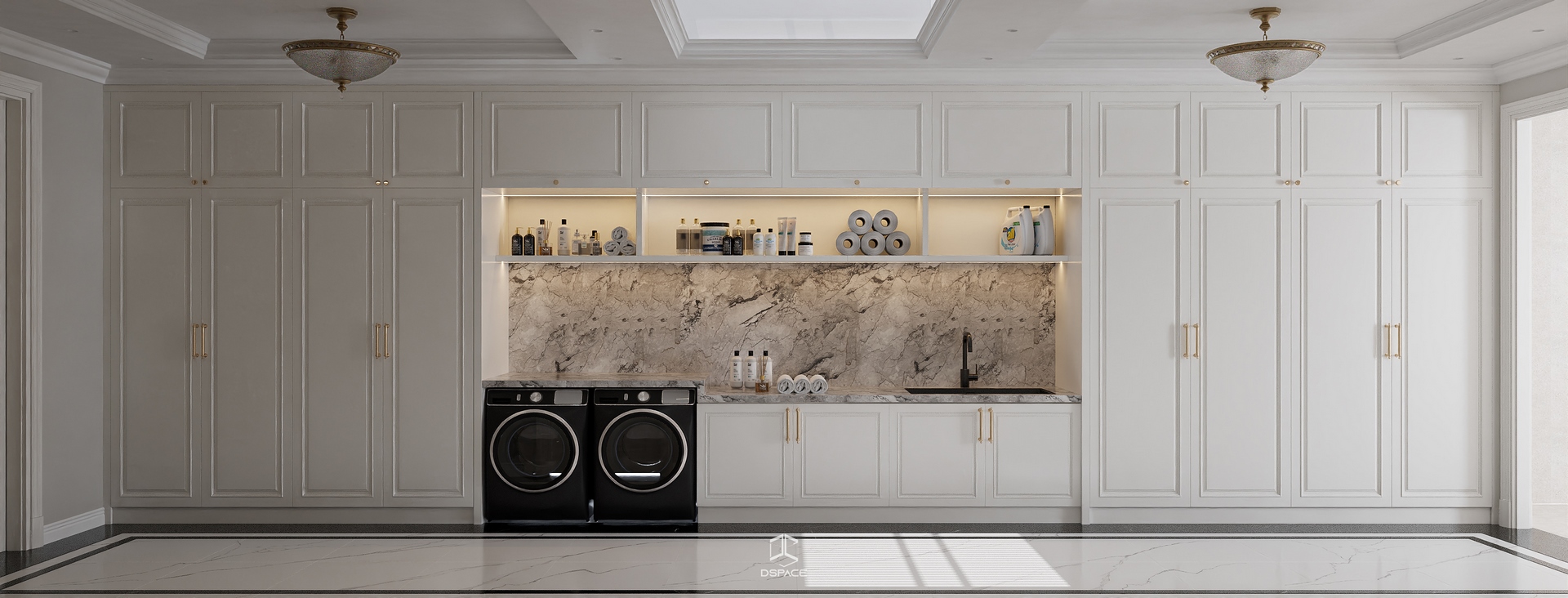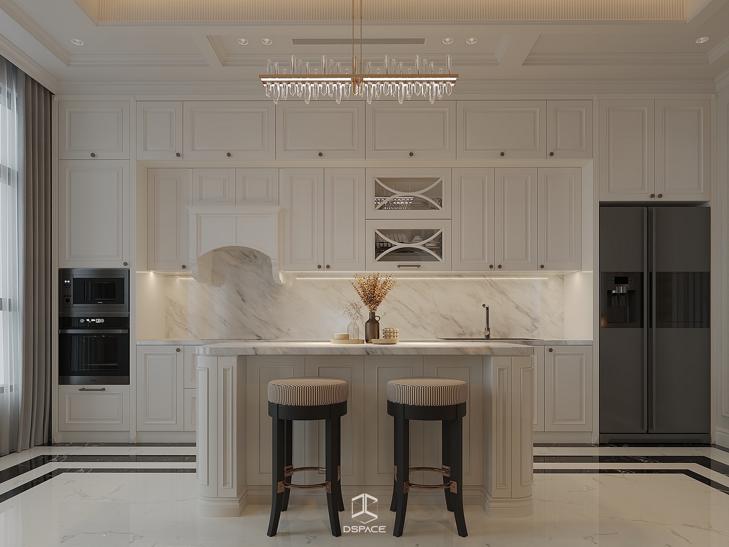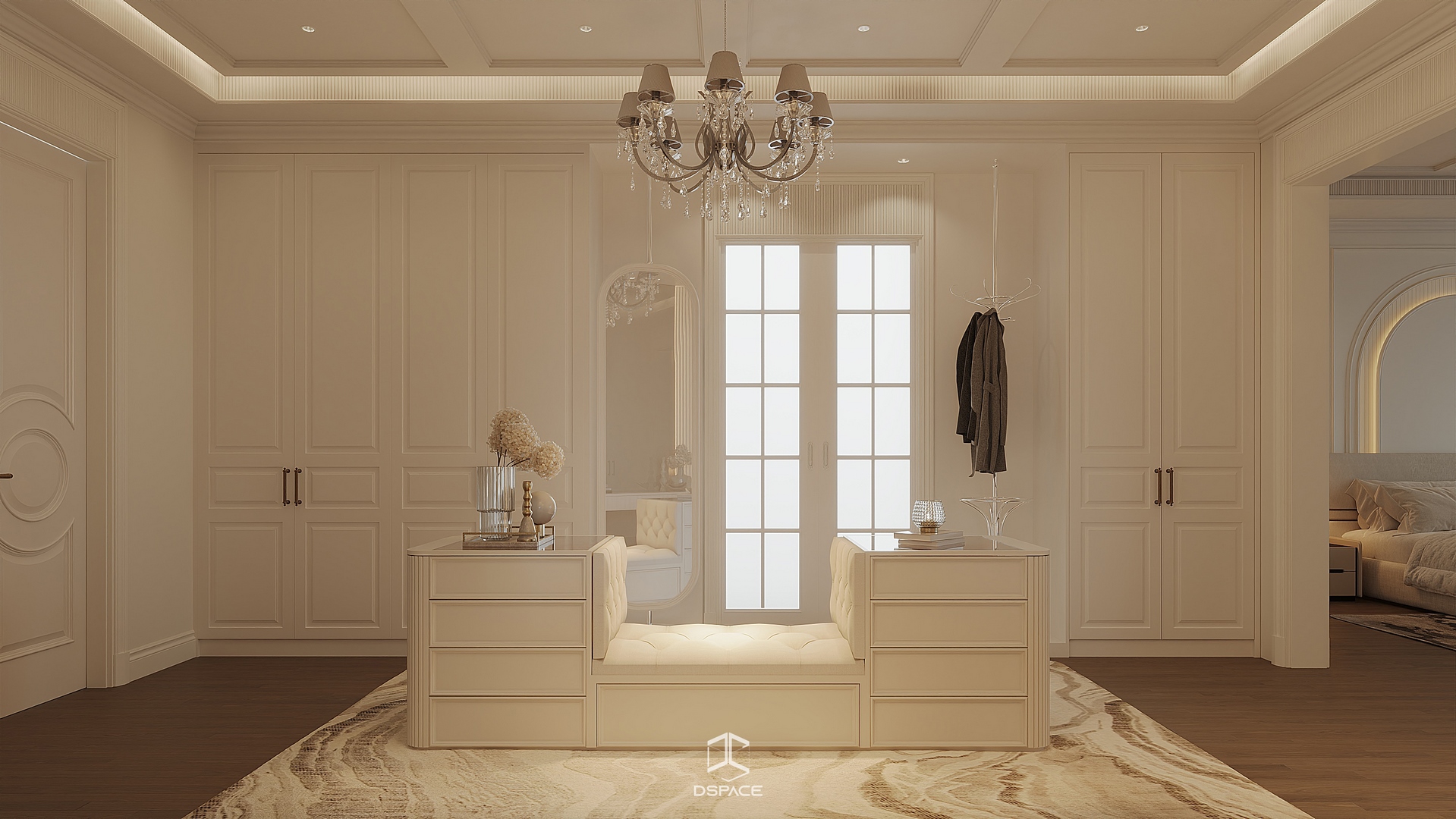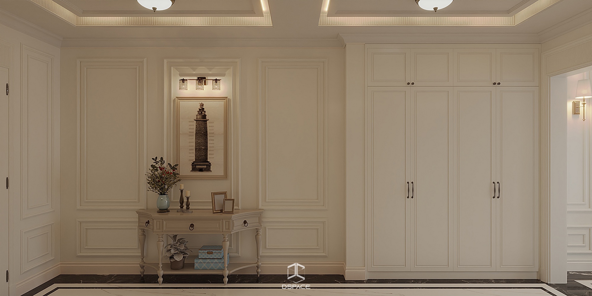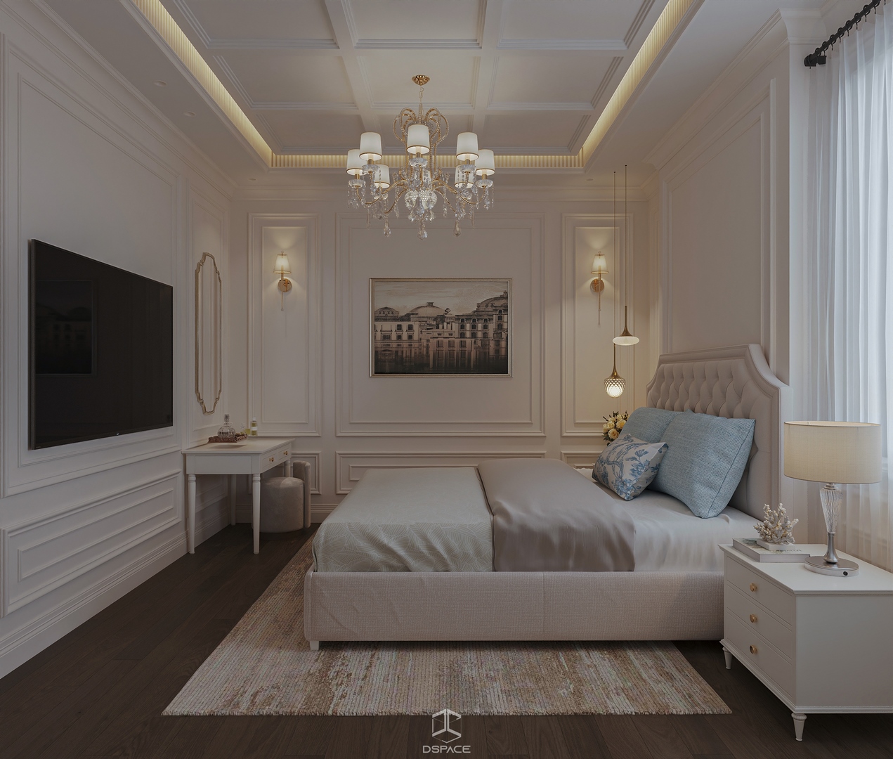 Hệ phào chỉ được xử lý tỉ mỉ, kết hợp cùng bố cục cân đối và ánh sáng tinh tế, tạo nên một tổng thể sang trọng nhưng không nặng nề.
